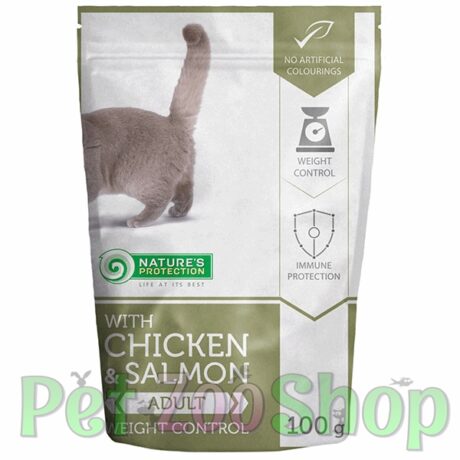 Nature’s Protection Adult Weight Control – komadići u sosu sa piletinom, lososom i tunjevinom. Podržava optimalnu telesnu težinu, zdrav digestivni sistem i vitalnost odraslih mačaka.
