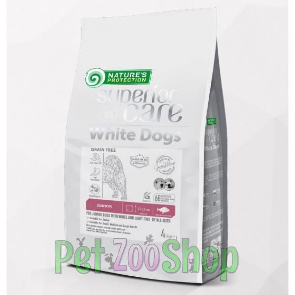 Nature’s Protection White Dog White Fish – Junior All Breeds je kompletna suva hrana za štence od 3–12 meseci, bele i svetle boje dlake, za sve rase.