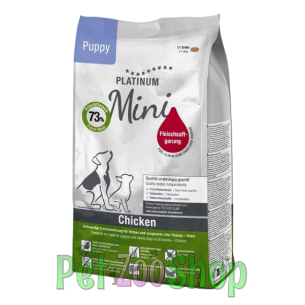 Platinum Dog Puppy Mini Chicken je kompletna i visokokvalitetna suva hrana posebno formulisana za štence malih i mini rasa, kako bi se zadovoljile njihove povećane energetske i nutritivne potrebe tokom rasta i razvoja. Receptura sadrži čak 73% svežeg pilećeg mesa, koje obezbeđuje lako svarljive proteine neophodne za pravilan razvoj mišićne mase, vitalnosti i snage.