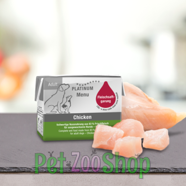 Platinum Menu Piletina je kompletna, visokokvalitetna vlažna hrana namenjena odraslim psima svih rasa. Napravljena je od pažljivo biranih, prirodnih sastojaka koji omogućavaju laku svarljivost i visoku nutritivnu vrednost, bez opterećenja digestivnog sistema.
