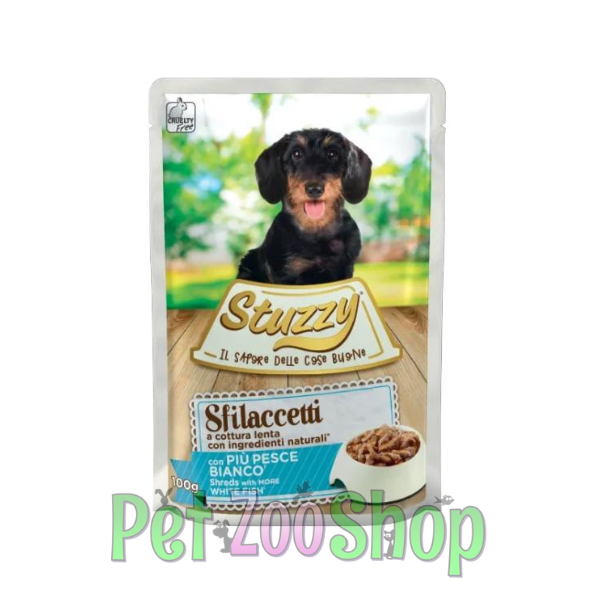 Ukusni Stuzzy Shreds prelivi sa tračicama bele ribe kuvane na pari, sa prirodnim sastojcima i visokim procentom mesa, namenjeni ishrani odraslih pasa.